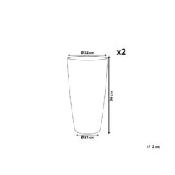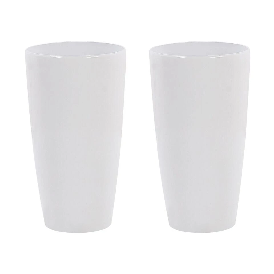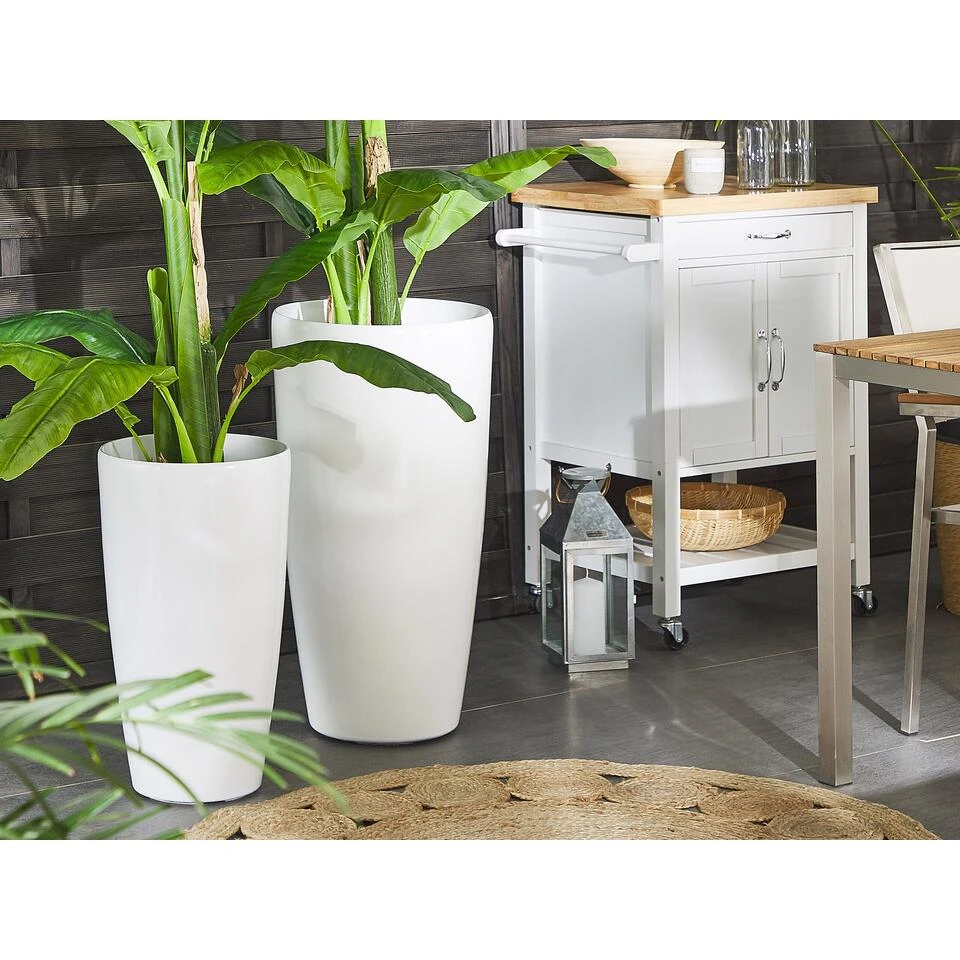 Set van 2 hoge ronde plantenbakken. Moderniseer je tuin met deze hoge, glanzende set van 2 plantenpotten. Het is gemaakt van een duurzame, hoogwaardige steenmix en kan worden gebruikt in de tuin of op het terras, omdat het UV- en weerbestendig is. Het oppervlak trekt de aandacht en wanneer het wordt gecombineerd met kleurrijke bloemen of decoratieve takjes, verbetert het de uitstraling van elke ruimte, omdat het ook binnenshuis kan worden gebruikt.