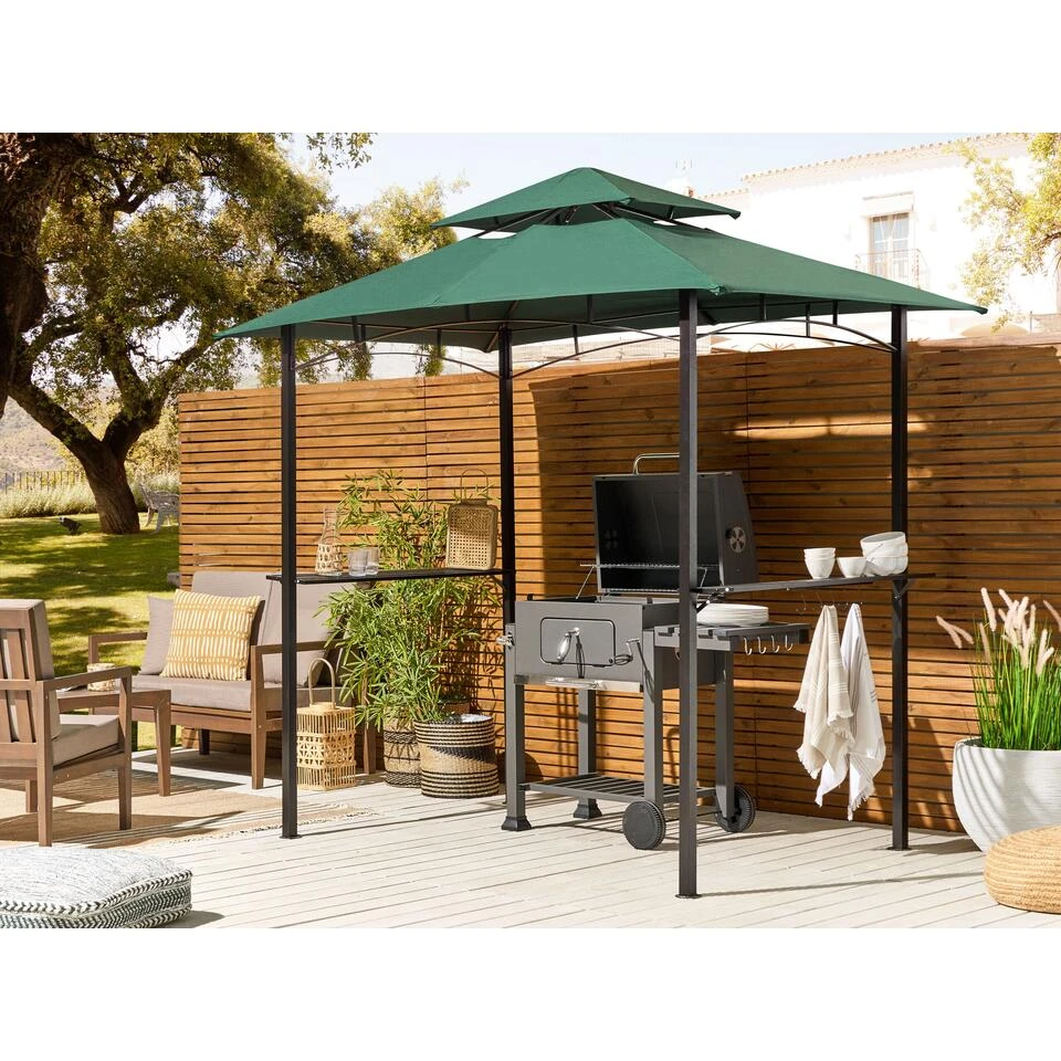 Moderne tuin prieel met planken. Maak je tuin klaar voor het barbecueseizoen en warme zomeravonden met vrienden en familie met dit tuinpaviljoen. Je kan er gemakkelijk een kleine tuinset of loungeset in kwijt. Het paviljoen is gemaakt van duurzaam gepoedercoat staal waardoor het een stabiele structuur heeft. De overkapping is gemaakt van een materiaal dat goed beschermt tegen Uv-stralen. Daarnaast heeft het een opening in het dak waardoor je altijd luchtcirculatie hebt. Het paviljoen heeft metalen planken en haken die je zullen helpen om je accessoires of bloempotten tentoon te stellen waardoor het geheel nog stijlvoller wordt.