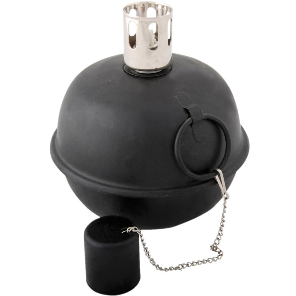 Tuimeltoorts/olielamp zwart met deksel om de vlam te doven. De tuimeltoorts geeft een sterke heldere vlam. Aan de onderkant is de lamp verzwaard met grind zodat de lamp terug in positie komt wanneer hij uit balans is. De lamp brandt ongeveer 24 uur voordat deze bijgevuld moet worden. Materiaal: metaal. Afmeting: 14 x 15 cm.