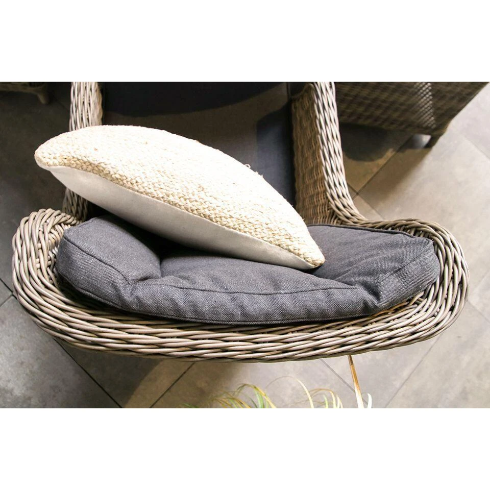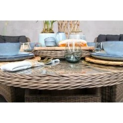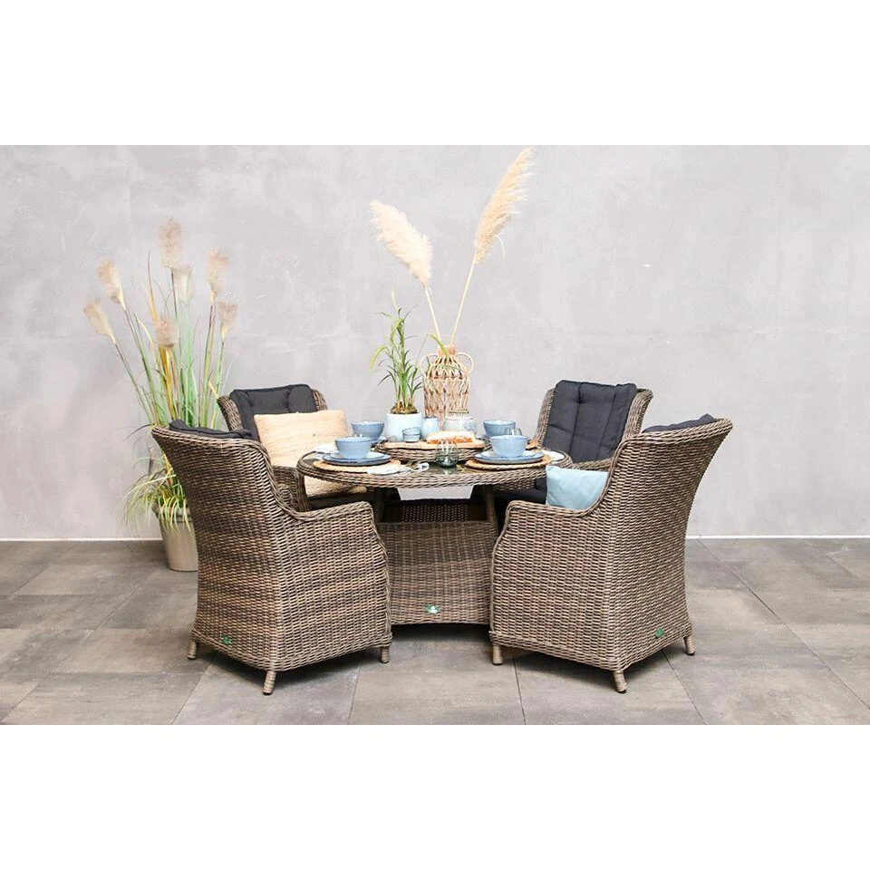 De royale afmetingen en rondingen geven de La Donna tuinset een klassieke stijl. Deze tuinset is gemaakt van wicker met een warme natuurlijke kleur en bijpassende grijskleurige kussens wat zorgt voor een robuuste uitstraling. De tuinstoelen hebben een prettig comfort en zithoogte om comfortabel te kunnen dineren. Daarnaast heeft de tafel een handig draaiplateau waardoor u nog meer gebruiksplezier heeft met de La Donna tuinset.