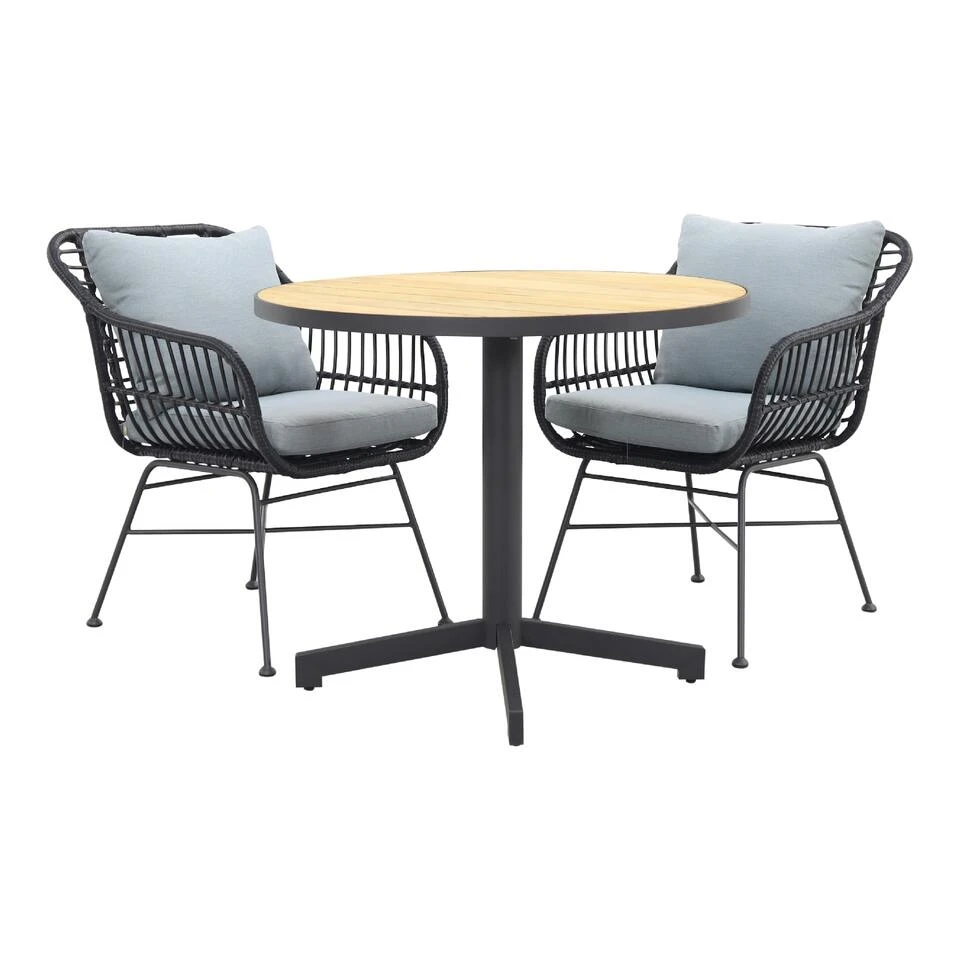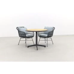 Wil jij graag een tuinset voor 2 met opvallend design? Dan is de Margriet/Fiesta mogelijk de juiste tuinset voor jou! De Margriet tuinstoelen worden gekenmerkt door het zwarte wicker in combinatie met de mooie mint grey kussens. Deze kleuren combinatie zorgt voor een frisse look. De tuintafel maakt dit plaatje helemaal af met het donkere frame en teakhouten tafelblad. Gezamenlijk is het een echte showstopper! Doordat de tafel een doorsnede heeft van 90 cm. past deze met 2 stoelen op een balkon of kleine tuin. Waar ga jij hem neerzetten?