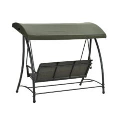 Voor de zit- en rugleuning van de bank is gebruik gemaakt van een textilene all-weather doek. Om deze stevige schommel bank net even iets gezelliger te maken is er een dakje toegevoegd van een mosgroen polyester doek. Het dakje kun je iets kantelen, waardoor je zelf de gewenste stand kunt bepalen. Kortom, voor het ultieme relaxen, ga je lekker schommelen in een schommelbank in de tuin.