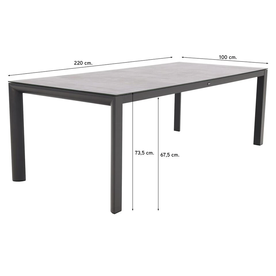 De Baltimor tuintafel biedt met zijn lengte van 220 cm. plaats aan 6 personen. Je kan eventueel met 8 personen dineren door gebruik te maken van de kopse kanten van de tafel. Het frame van de Baltimor tuintafel is vervaardigd uit gepoedercoat aluminium. Aluminium heeft als voordeel dat het licht in gewicht is, weinig onderhoud nodig heeft en jarenlang meegaat. Het tafelblad van de Baltimor tuintafel is gemaakt van “ceramic on glass”. Dit is een keramiek laagje dat op een geharde glasplaat wordt aangebracht. Beide materialen zijn bestand tegen diverse weersinvloeden en perfect geschikt voor gebruik buitenshuis. Wanneer het tafelblad vies is geworden kun je deze het beste schoonmaken met water en een zachte doek. Voor een grote schoonmaakbeurt kun je een neutraal reinigingsmiddel toevoegen. Gebruik voor het schoonmaken nooit schuurmiddelen zoals een schuursponsje. Dit kan namelijk vegen en vlekken veroorzaken die er niet meer uit gaan. Gebruik nooit een hogedrukreiniger. Door de hoge waterdruk kan het materiaal aangetast worden.