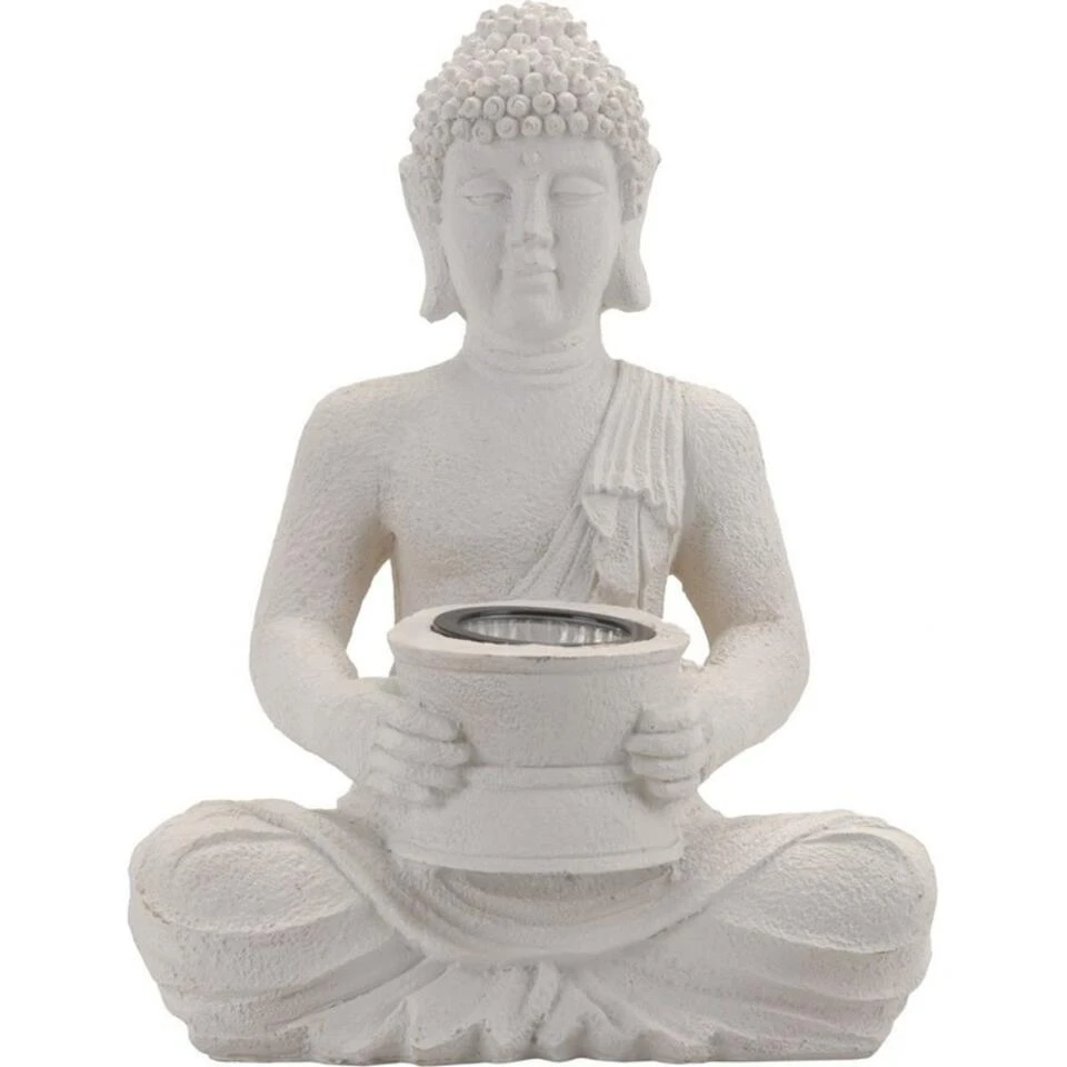 Witte solar Boeddha beeld tuinverlichting, welke werkt op zonne-energie. Het lampje zal overdag opladen en automatisch aan gaan zodra het schemerig wordt. Materiaal: polystone. Afmeting: ca. 21 x 16 x 31 cm. Solar tuinverlichting/tuindecoratie Boeddha beelden.