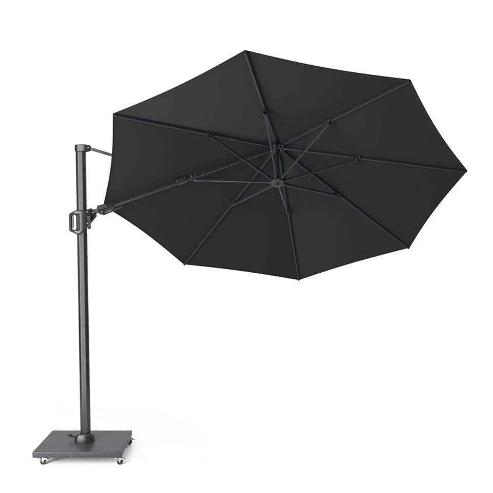 De Platinum Challenger T2 rond met Premium parasoldoek in de kleur Faded Black is de zweefparasol waarmee je altijd in de schaduw kunt zitten. De parasol is namelijk 360 graden draaibaar. Ook is de Challenger kantelbaar richting het bedieningspaneel (achterwaarts), zijwaarts en naar links en rechts. Hiermee kan je perfect inspelen op de stand van de zon. Ook zorgt het ervoor dat je Challenger T2 Rond bijna nooit hoeft te verplaatsen. Het frame is van aluminium en is voorzien van een antraciet coating. Het premium parasoldoek is uitgevoerd in de kleur Faded black. De baleinen van de Platinum Challenger T2 zijn voorzien van doekspanners. Deze zorgen ervoor dat het parasoldoek altijd mooi strak blijft staan. De Challenger T2 heeft een doorsnede van 350 cm.
