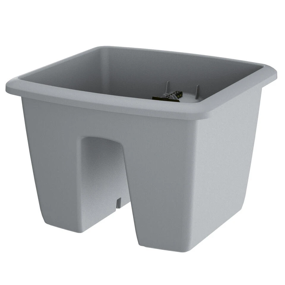 1x Kunststof balkon plantenpotten/bloempotten lichtgrijs 29 cm. Serie: respana railing. Formaat: lengte ca 28,8 cm. Breedte ca 29,8 cm. Hoogte ca 20,9 cm (afmeting gleuf ca. 14 x 8 cm). Inhoud: 9 liter. Materiaal: kunststof. Kras en stootvast, zonder afwateringsgaten. Geschikt voor binnen en buiten gebruik. Tuin en balkon decoratie plantenpot/bloempot.