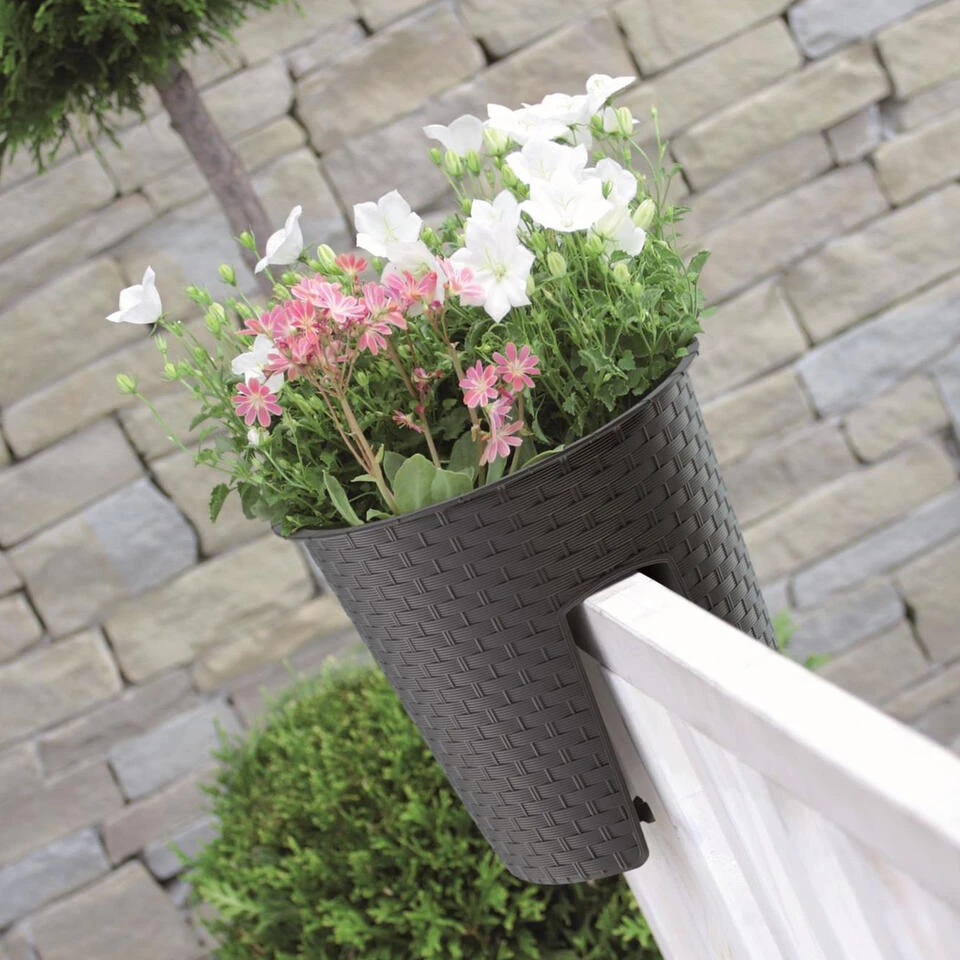 1x Kunststof Ratolla rotan balkon plantenpotten/bloempotten taupe 6 liter. Serie: ratolla railing. Kras en stootvaste bloempot/plantenbak met rotanvlechtwerk uitstraling, zonder gaten. Afgeronde doos voor montage op leuningen en balustrades. Formaat: lengte ca 29,8 cm. Breedte ca 24,2 cm. Hoogte ca 22,5 cm. Inhoud: 6 liter. Materiaal: kunststof. Geschikt voor binnen en buiten gebruik. Tuin en balkon decoratie plantenpot/bloempot.