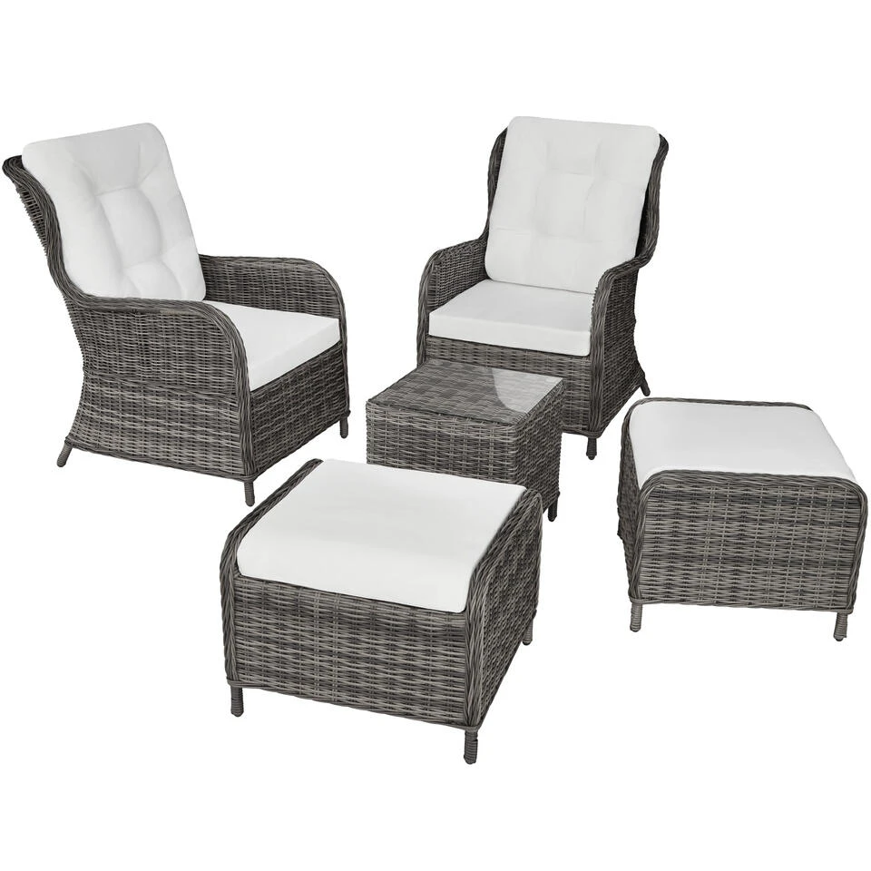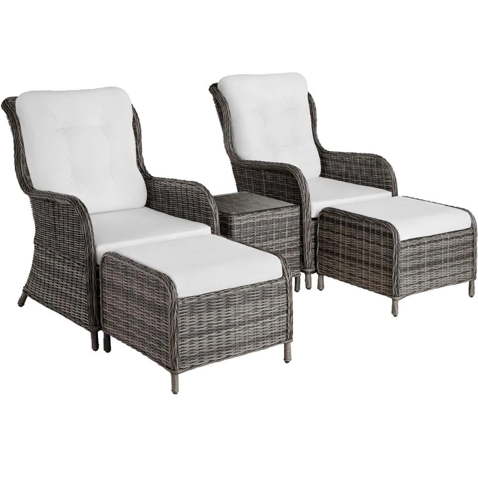 Onze klaar gemonteerde ratan set met modern golvend design ziet er stijlvol uit en is daarbij ook nog eens heel comfortabel! Het fijne, ronde vlechtwerk is van structuur en patroon nauwelijks te onderscheiden van echt ratan. De dikke, waterafstotende kussens en de krukken die als voetsteunen kunnen worden gebruikt, bieden optimale ontspanning. Deze roestvrije meubelset met duurzaam oppervlak van polyratan en het stabiele onderframe van aluminium zijn perfect geschikt voor de open lucht.