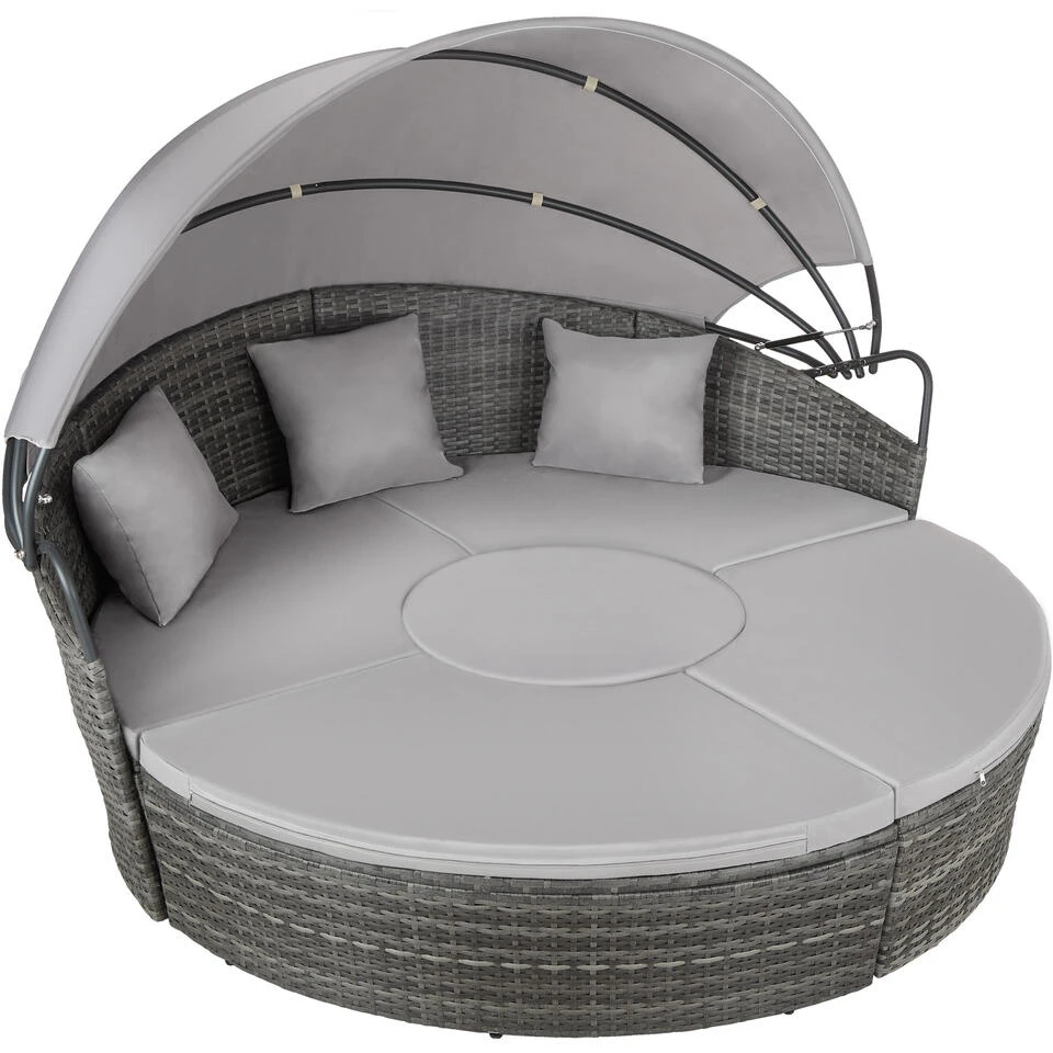 Het functionele ratan zonne-eiland van tectake wordt gekenmerkt door zijn aantrekkelijke design en zijn hoog zit- en ligcomfort. De combineerbare individuele elementen met waterafstotende kussens presenteren zich geheel naar smaak als meerdelige zitgroep of als groot loungebed. Het stabiele zonnedak is bevestigd met kleefsluiting en biedt opgespannen bescherming tegen hitte en wind. Het hoogwaardige vlechtwerk van duurzaam polyratan en het robuuste frame van staal maken dit veelzijdige ratan zonne-eiland van tectake tot het perfecte feel good-oase.