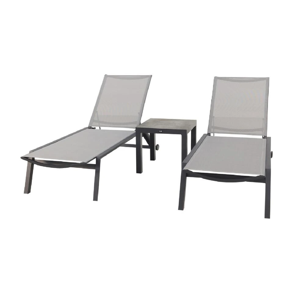 Deze loungeset bestaat uit 2 verstelbare ligstoelen en 1 bijzettafel.
