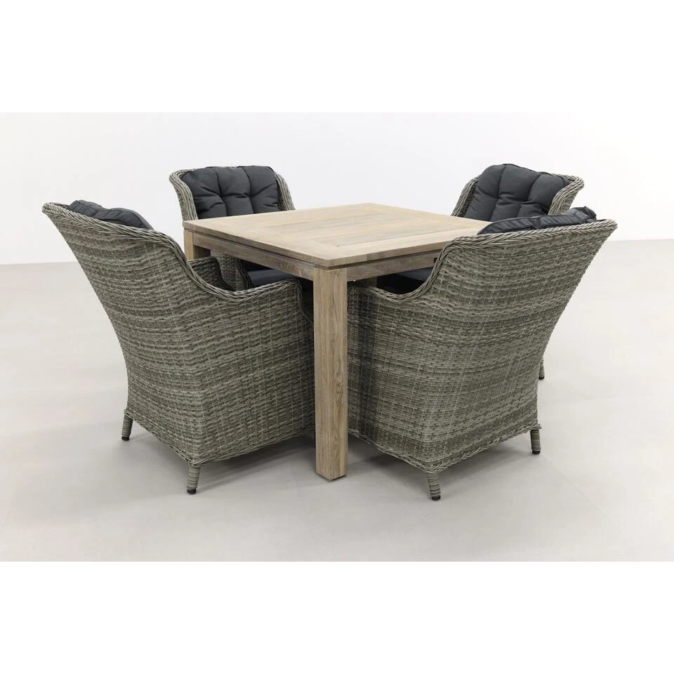 Heb je een kleinere tuin en wil jij wel lekker in stijl dineren buiten? Dat kan met deze King/Rome tuinset voor 4 personen! De King tuinstoel laat je als een koning voelen als je erop gaat zitten. Dat komt mede door de comfortabele kussens en de hoge rugleuning. Hierdoor krijgt je rug veel steun en blijf je met gemak de hele avond door borrelen. De Rome tuintafel past met zijn grijze kleur perfect bij het grijze wicker van de stoelen. De vierkante tuintafel is gemaakt van massief teakhout. Door middel van een grey wash heeft het hout zijn grijze kleur gekregen. Met deze tuinset zit je heerlijk, dan is het alleen nog hopen op goed weer! Waar zet jij deze tuinset neer? Bestel direct online.