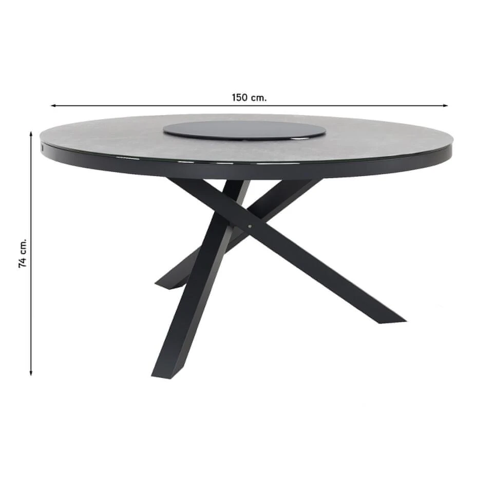De poten van de Ronde tuintafel Perth hebben een kruisvorm en zijn gemaakt van aluminium. Dit materiaal is licht van gewicht, stevig en het materiaal kan niet gaan roesten. Dit maakt het perfect materiaal voor deze ronde tuintafel. Het tafelblad is van keramiek. Dit is een harde steensoort die gespoten is op een plaat van veiligheidsglas. Het keramiek is kras vast, hitte bestendig en UV bestendig. Kortom ideaal om te gebruiken als tafelblad. De lazy Susan, ook wel draaiplateau genoemd, wordt standaard bij de tafel geleverd. Dit plateau is draaibaar en ideaal als je met meerdere mensen aan de ronde tuintafel eet. Het doorgeven wordt met het draaiplateau een feestje.